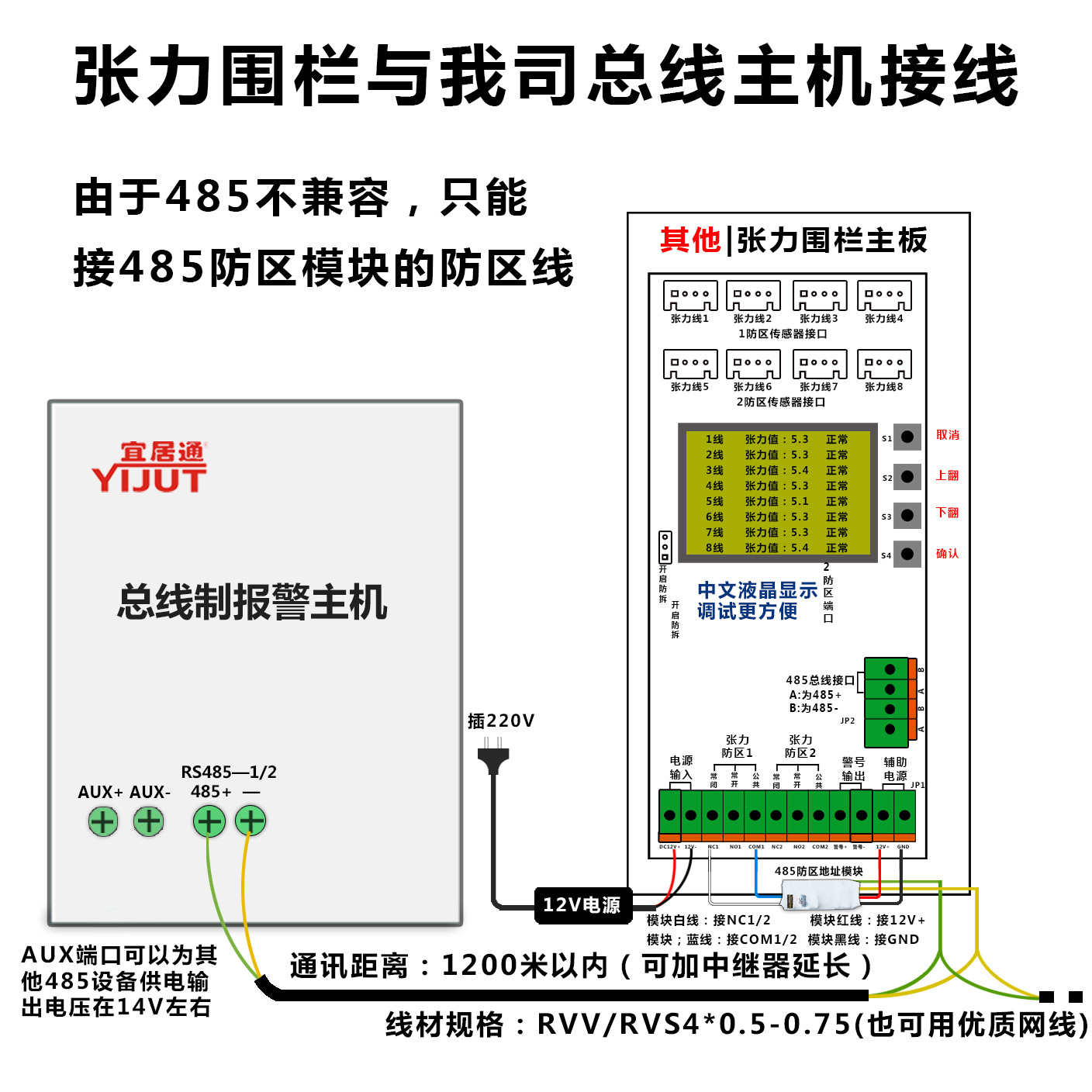 以下是張力電子圍欄主機與總線制報警主機接線示意圖