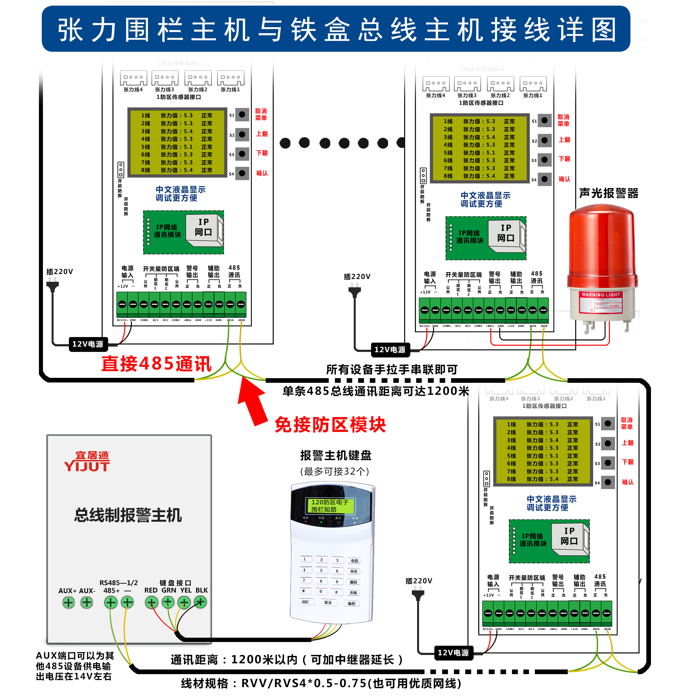 以下是張力電子圍欄主機系統(tǒng)與總線制報警主機接線詳圖