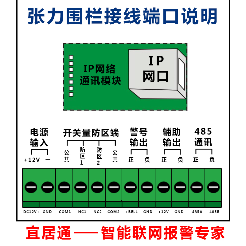 通訊方式 | 485/開關量/IP網絡(走485只能配宜居通總線報警主機,開關量可通用) |