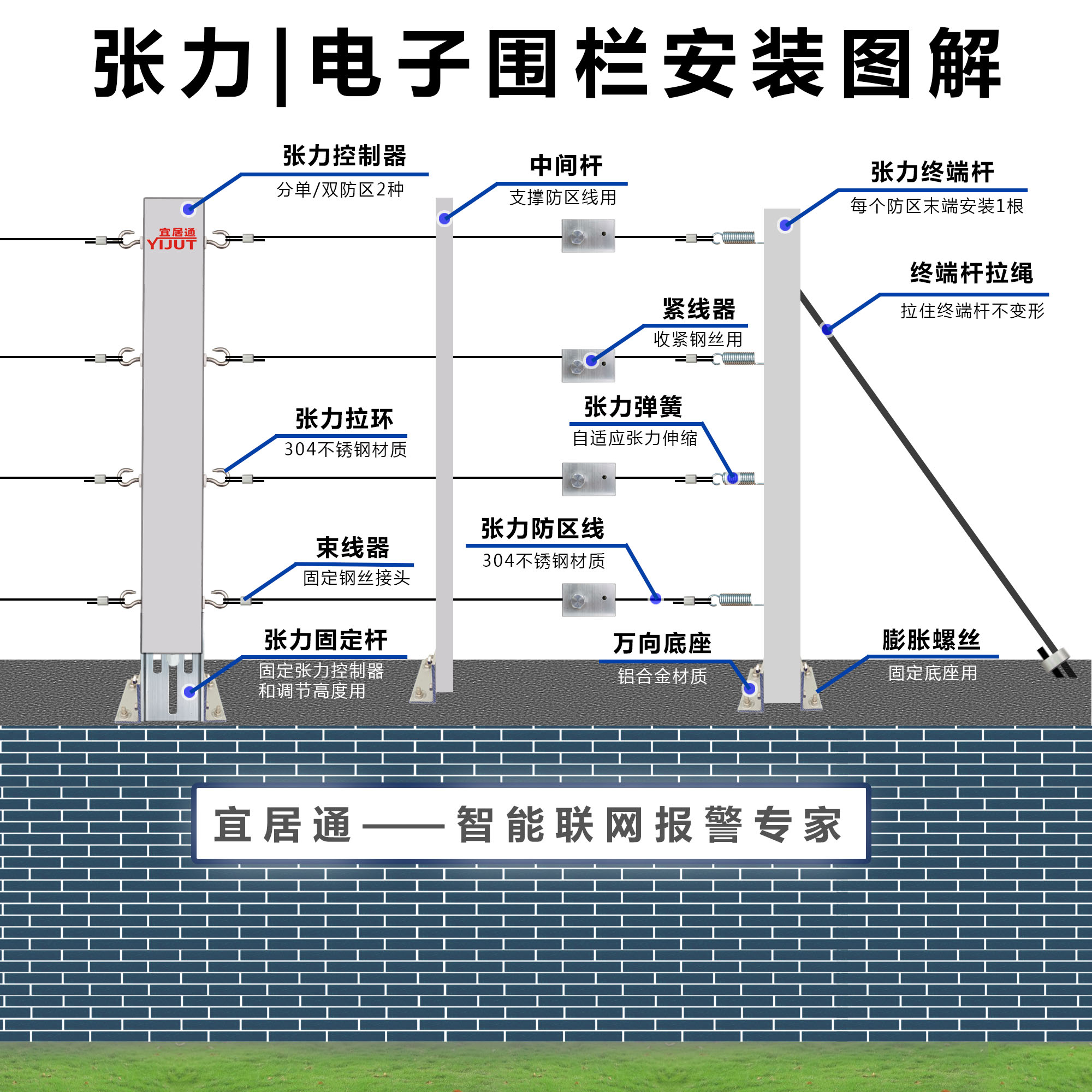 張力電子圍欄系統(tǒng)由張力電子圍欄主機/控制器、前端配件和報警中心的報警報警控制主機及接警管理軟件 三部分組成。前端由控制桿(含張力圍欄控制器/控制主機、接開關(guān)量的話還要陪控制模塊)、受力桿/終端桿、轉(zhuǎn)角桿/轉(zhuǎn)向桿、支撐桿/過線桿、調(diào)節(jié)桿/固定桿、鋼絲繩、彈簧、緊固件/束線器、滑輪、警示牌等組成。張力電子圍欄報警系統(tǒng)由于采用全新的探測方式和特殊的信號處理方法,確保環(huán)境的變化不會引起張力靜態(tài)值、張力報警值、張力報警閾值的變化,徹底改變了以往周界安防探測器環(huán)境適應(yīng)性差、易誤報的缺點。
