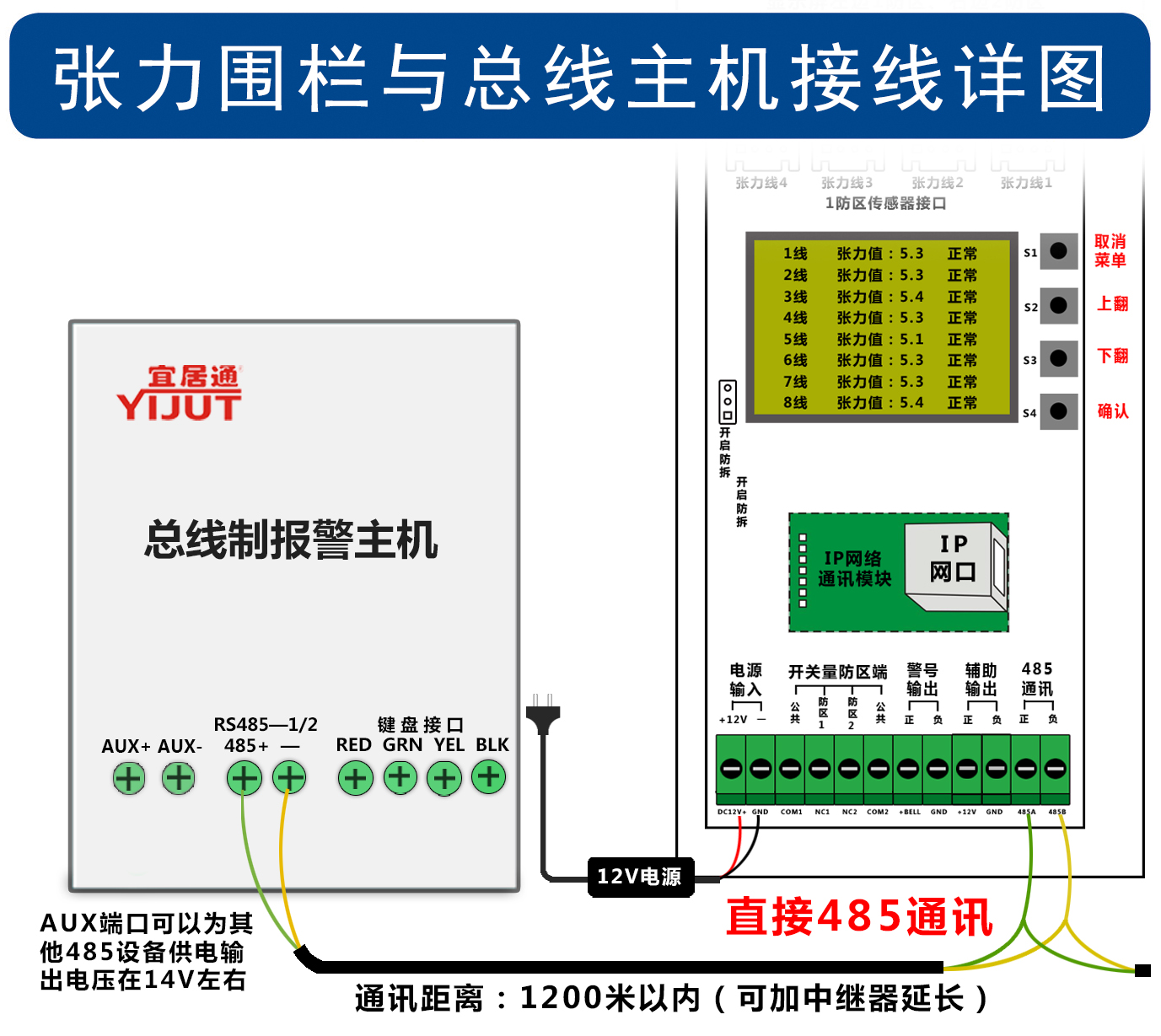 l 如果張力電子圍欄控制器的總控主機配置的是宜居通總線主機則可直接在總線主機上面進行外接擴展宜居通張力電子圍欄控制器即可,不需要配置防區(qū)地址模塊,總控主機可直接反向?qū)θ我庖慌_張力電子圍欄控制器進行布防/撤防控制
