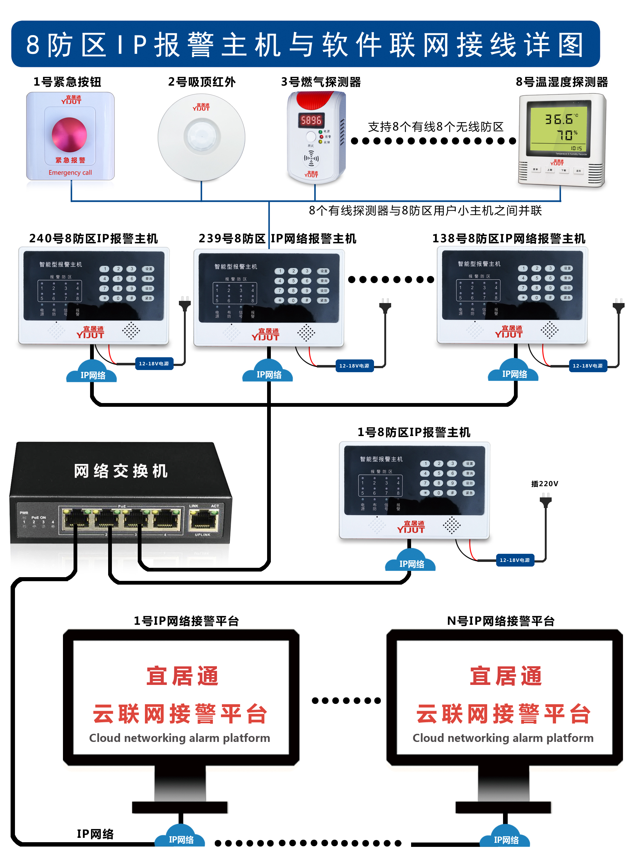 8防區(qū)IP網(wǎng)絡(luò)報警主機聯(lián)網(wǎng)應(yīng)用方案圖如下所示: