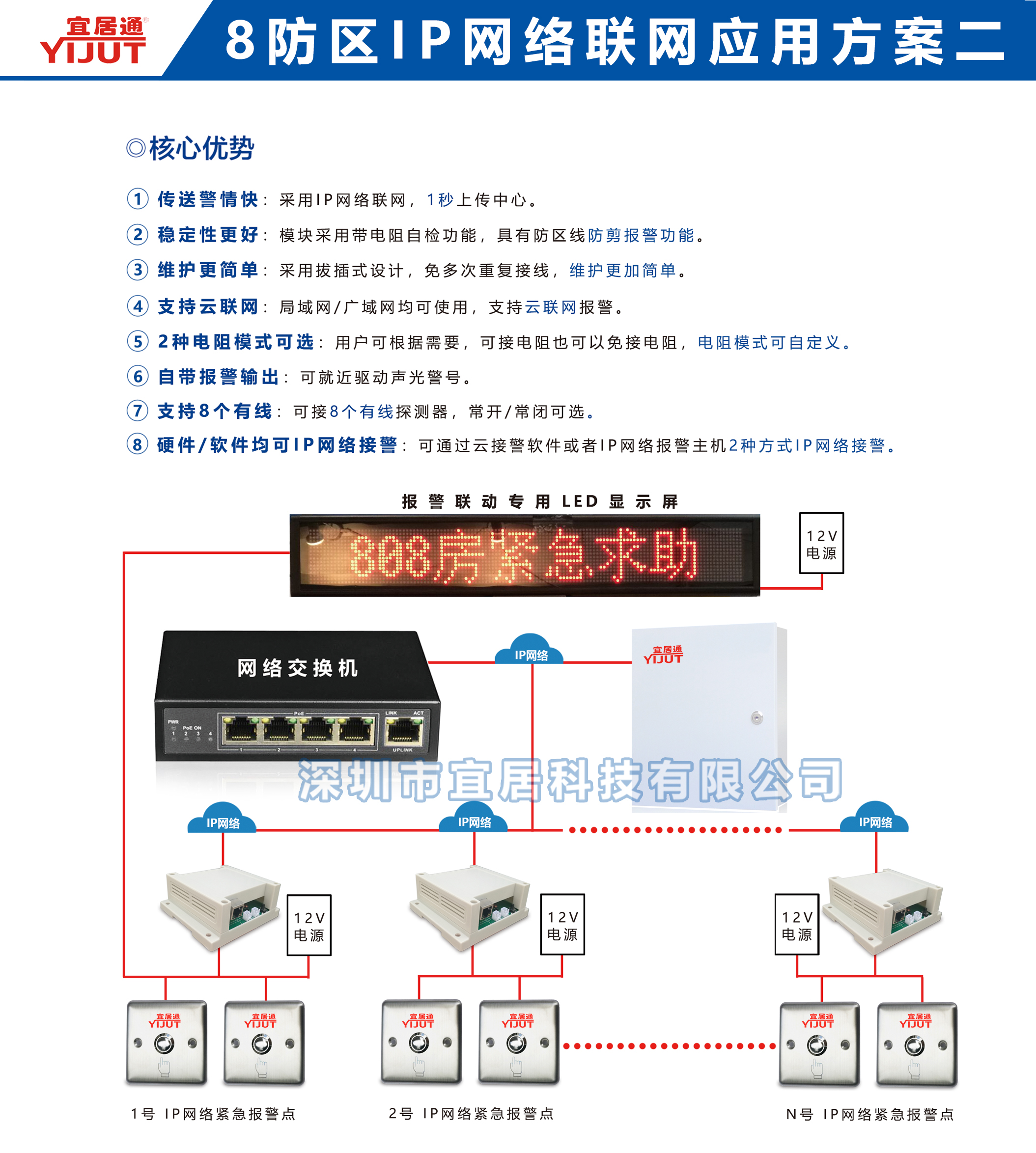 深圳市宜居科技有限公司專業(yè)研發(fā)IP網(wǎng)絡(luò)報警系統(tǒng),產(chǎn)品分為電子圍欄網(wǎng)絡(luò)報警主機系統(tǒng)、周界網(wǎng)絡(luò)報警主機系統(tǒng)、一鍵緊急求助報警系統(tǒng)、大型總線制網(wǎng)絡(luò)報警主機系統(tǒng)、分線制網(wǎng)絡(luò)報警主機系統(tǒng)、燃氣泄露探測報警系統(tǒng)、紅外感應(yīng)報警系統(tǒng)等幾大板塊,不管是室內(nèi)紅外感應(yīng)報警系統(tǒng),還是用于學(xué)校或酒店緊急求助報警系統(tǒng),以及室外周界防盜報警系統(tǒng)均可用一臺大型總線制網(wǎng)絡(luò)報警主機集成聯(lián)網(wǎng)控制和管理,可滿足多個報警子系統(tǒng)以及不同類型的復(fù)雜聯(lián)網(wǎng)報警系統(tǒng)的應(yīng)用和需求,可為高端聯(lián)網(wǎng)報警客戶群體提供高端私人定制服務(wù)!免費提供各種聯(lián)網(wǎng)報警應(yīng)用方案設(shè)計!