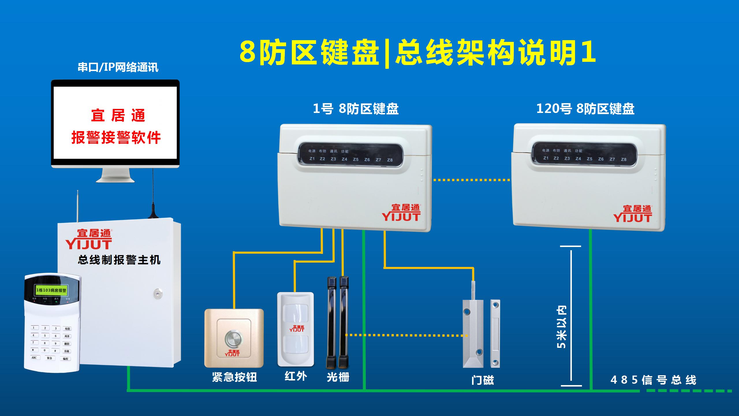 ?無(wú)線防區(qū)有線防區(qū)兼容設(shè)計(jì):該小型8防區(qū)用戶小主機(jī)具有485總線通訊功能,可與宜居通任意一款總線制報(bào)警主機(jī)進(jìn)行485有線聯(lián)網(wǎng)使用。