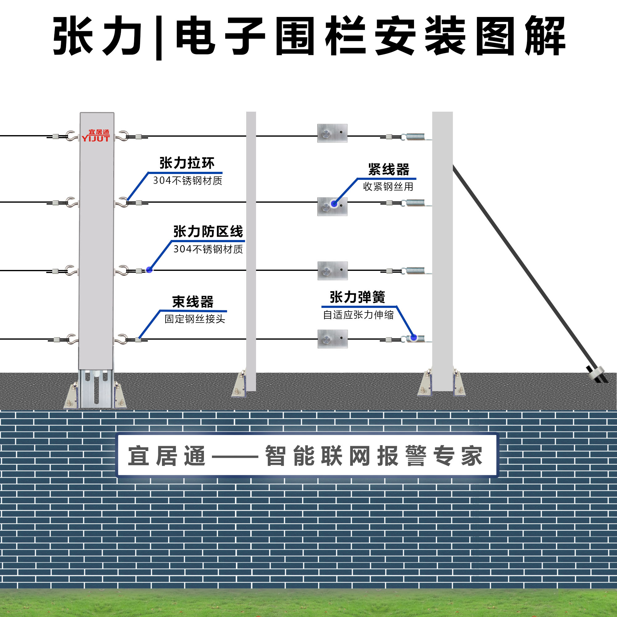 張力電子圍欄周界報警系統(tǒng)由張力電子圍欄主機/控制器、前端配件和報警中心的報警報警控制主機及接警管理軟件 三部分組成。前端由控制桿(含張力圍欄控制器/控制主機、接開關(guān)量的話還要陪控制模塊)、受力桿/終端桿、轉(zhuǎn)角桿/轉(zhuǎn)向桿、支撐桿/過線桿、調(diào)節(jié)桿/固定桿、鋼絲繩、彈簧、緊固件/束線器、滑輪、警示牌等組成。張力電子圍欄報警系統(tǒng)由于采用全新的探測方式和特殊的信號處理方法,確保環(huán)境的變化不會引起張力靜態(tài)值、張力報警值、張力報警閾值的變化,徹底改變了以往周界安防探測器環(huán)境適應(yīng)性差、易誤報的缺點。