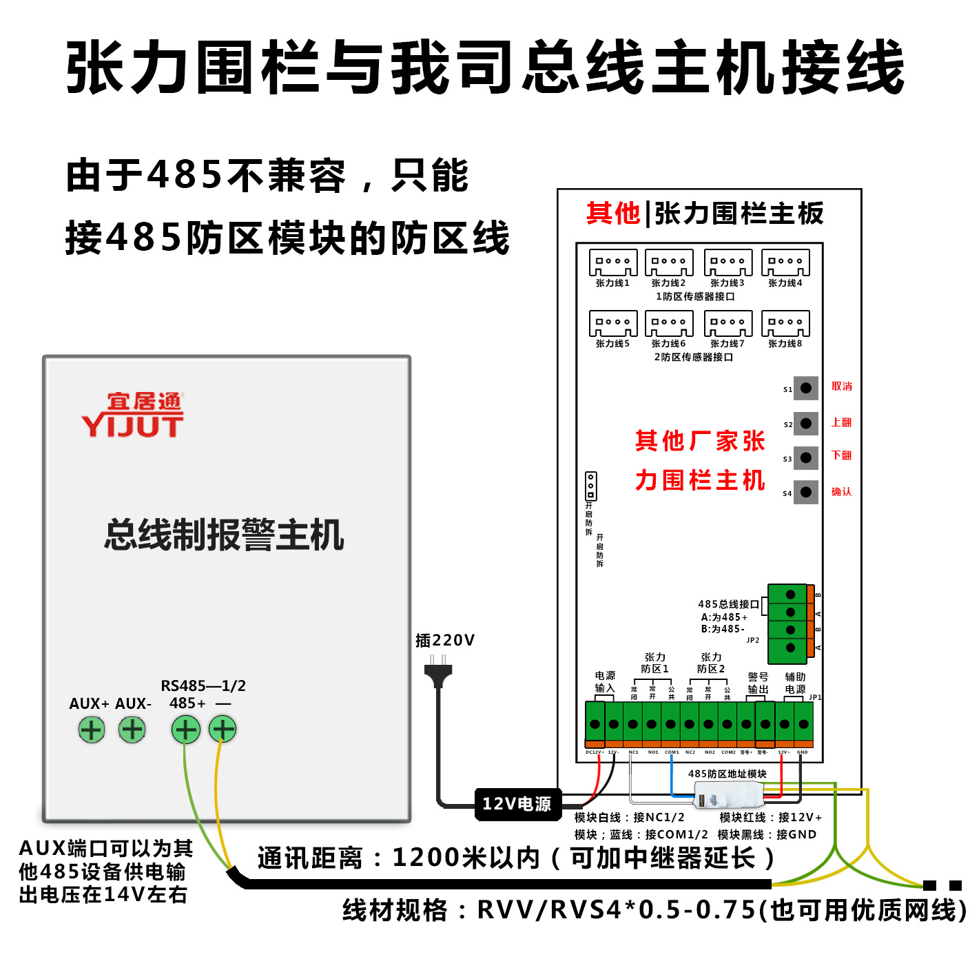 l 如果張力電子圍欄探測器的總控主機配置的是宜居通總線主機則可直接在總線主機上面進行外接擴展宜居通張力電子圍欄控制器即可,不需要配置防區(qū)地址模塊,總控主機可直接反向?qū)θ我庖慌_張力電子圍欄控制器進行布防/撤防控制