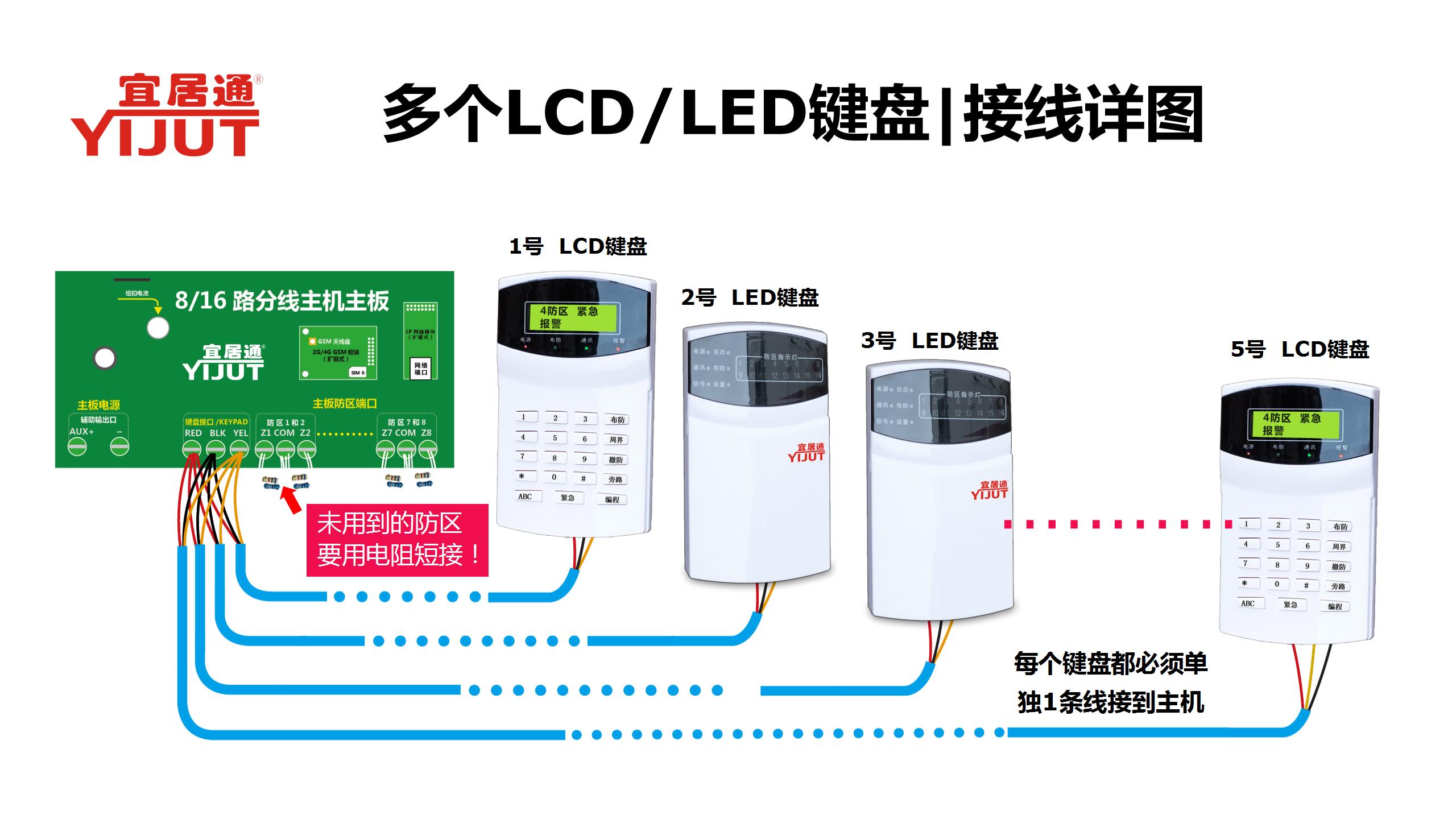 ● 接線說明:如果與分線報警主機共用電源,將分線報警主機的鍵盤接口KEYPAD對應(yīng)的RED、YEL、BLK與主機上鍵盤接口的 “紅(R)、黃(Y)、黑(B)”端子分別相互連接即可,最后再將鍵盤的綠線和主機鍵盤接口的BLK連接。