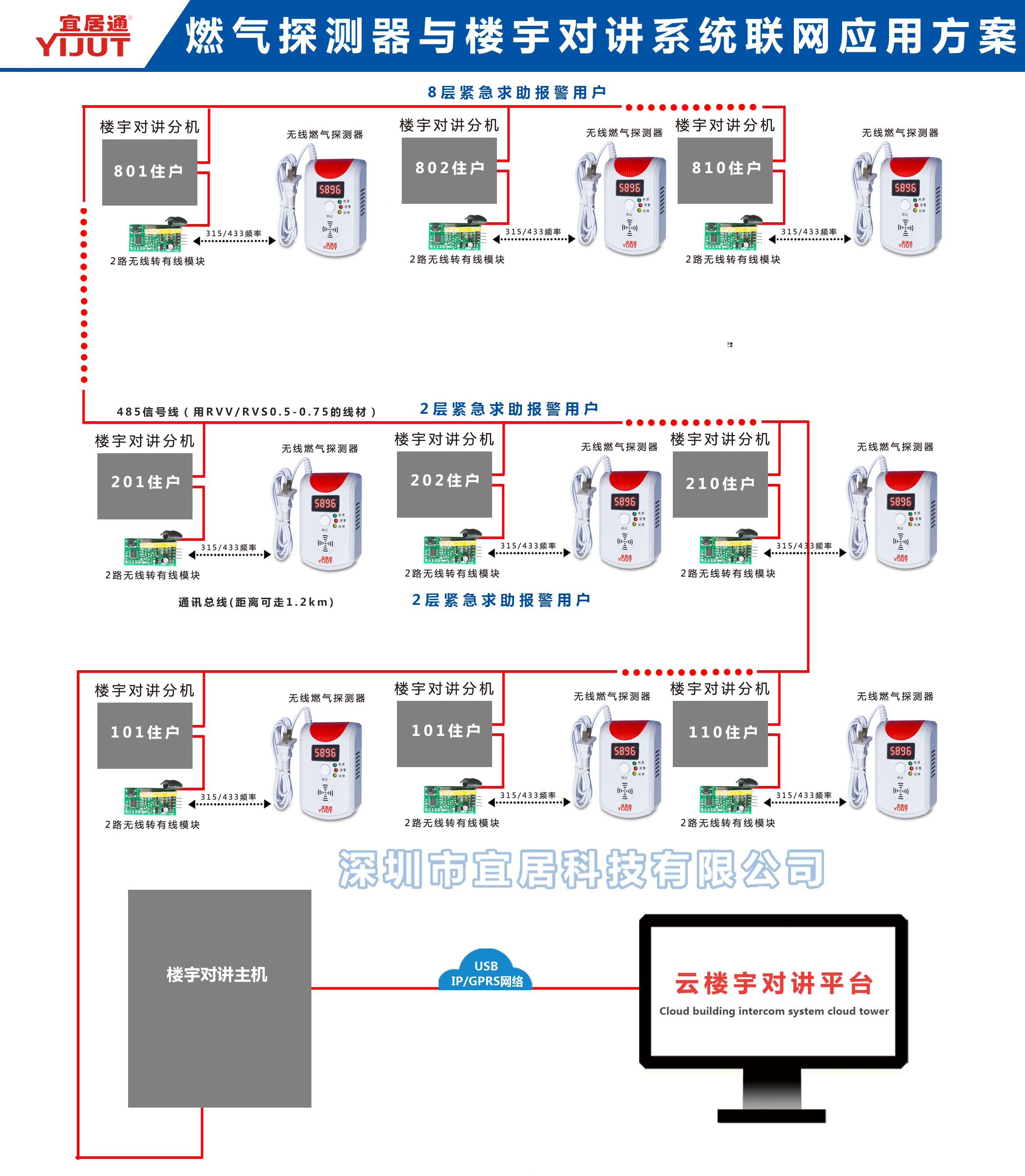 以下是燃氣探測器報警器與樓宇對講系統(tǒng)聯(lián)網(wǎng)應(yīng)用方案圖