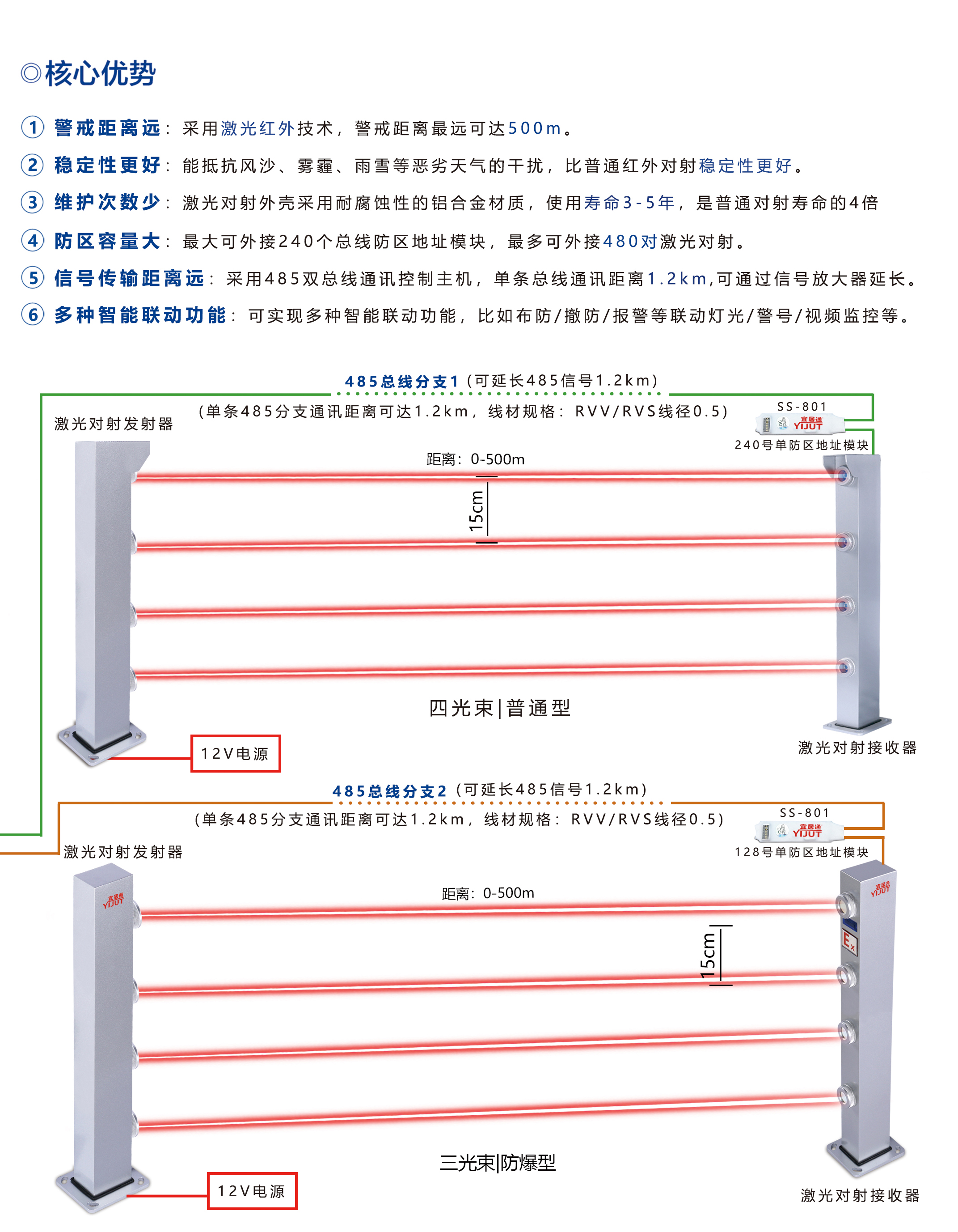 2、激光對射自身抗電磁干擾性強(qiáng),并對警戒激光束傳播通路以外的區(qū)域、設(shè)備無任何電磁干擾。