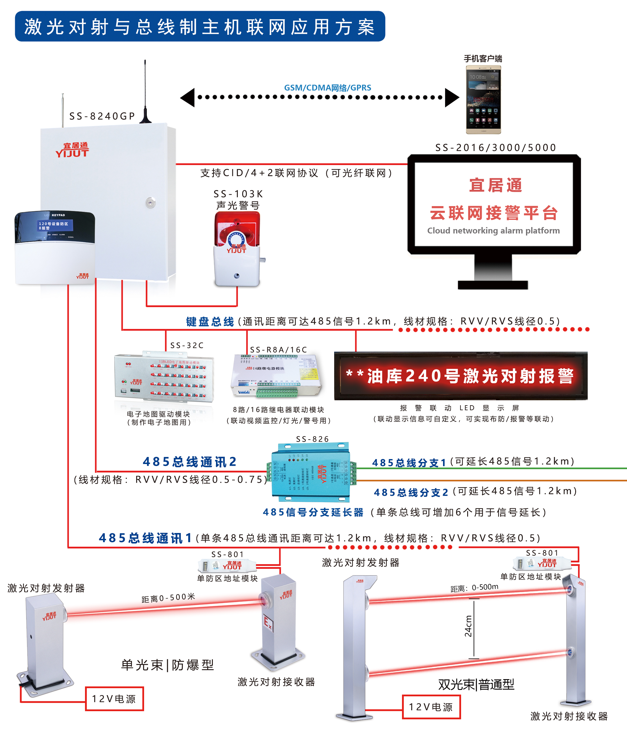 激光紅外對射與總線制報警主機(jī)系統(tǒng)聯(lián)網(wǎng)應(yīng)用方案圖如下所示: