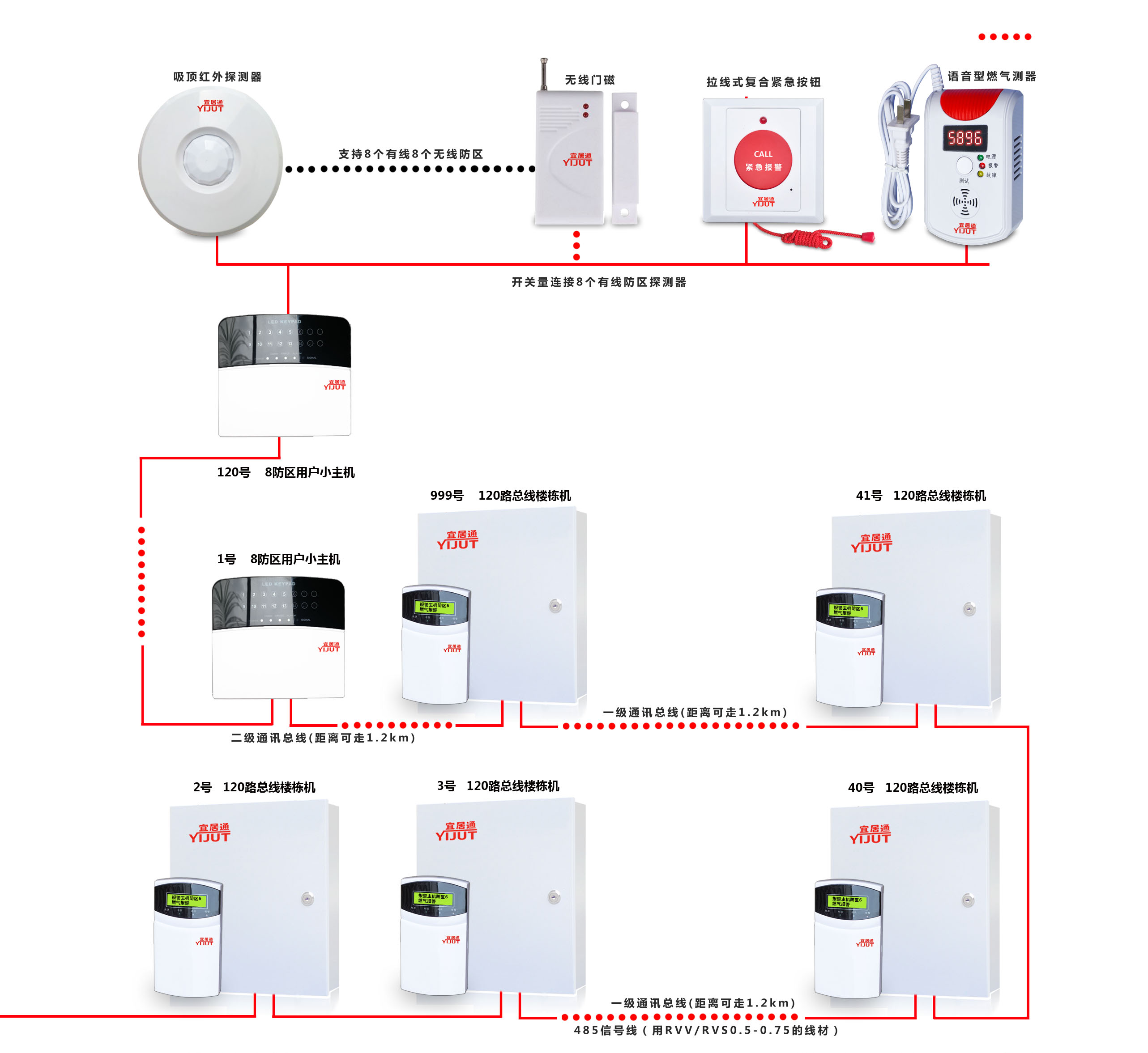 以上是RS485大型總線制報警主機系統(tǒng)在大型小區(qū)智能聯(lián)網(wǎng)報警中的實際應用方案圖,不同的方案所采用的布線方式有所不同,其中,有485總線制聯(lián)網(wǎng)報警應用方案圖。通過以上大型總線制聯(lián)網(wǎng)報警系統(tǒng)方案圖可以看出,該總線制聯(lián)網(wǎng)報警系統(tǒng)具有很強的防區(qū)擴展能力,采用二級總線設計方式,具有靈活的總線擴展能力,每棟樓配置一臺小型總線樓棟控制器,通過一級總線把所有的總線制樓棟控制器進行串聯(lián)起來即可,從總線樓棟控制器再進行二級總線擴展8防區(qū)用戶小主機等防區(qū)擴展設備,每家每戶配置一個8防區(qū)用戶小主機即可,具有接線簡單,施工方便,穩(wěn)定性好,性價比高等諸多優(yōu)勢,是目前大型小區(qū)智能物聯(lián)網(wǎng)報警應用最多的一款聯(lián)網(wǎng)報警系統(tǒng)。