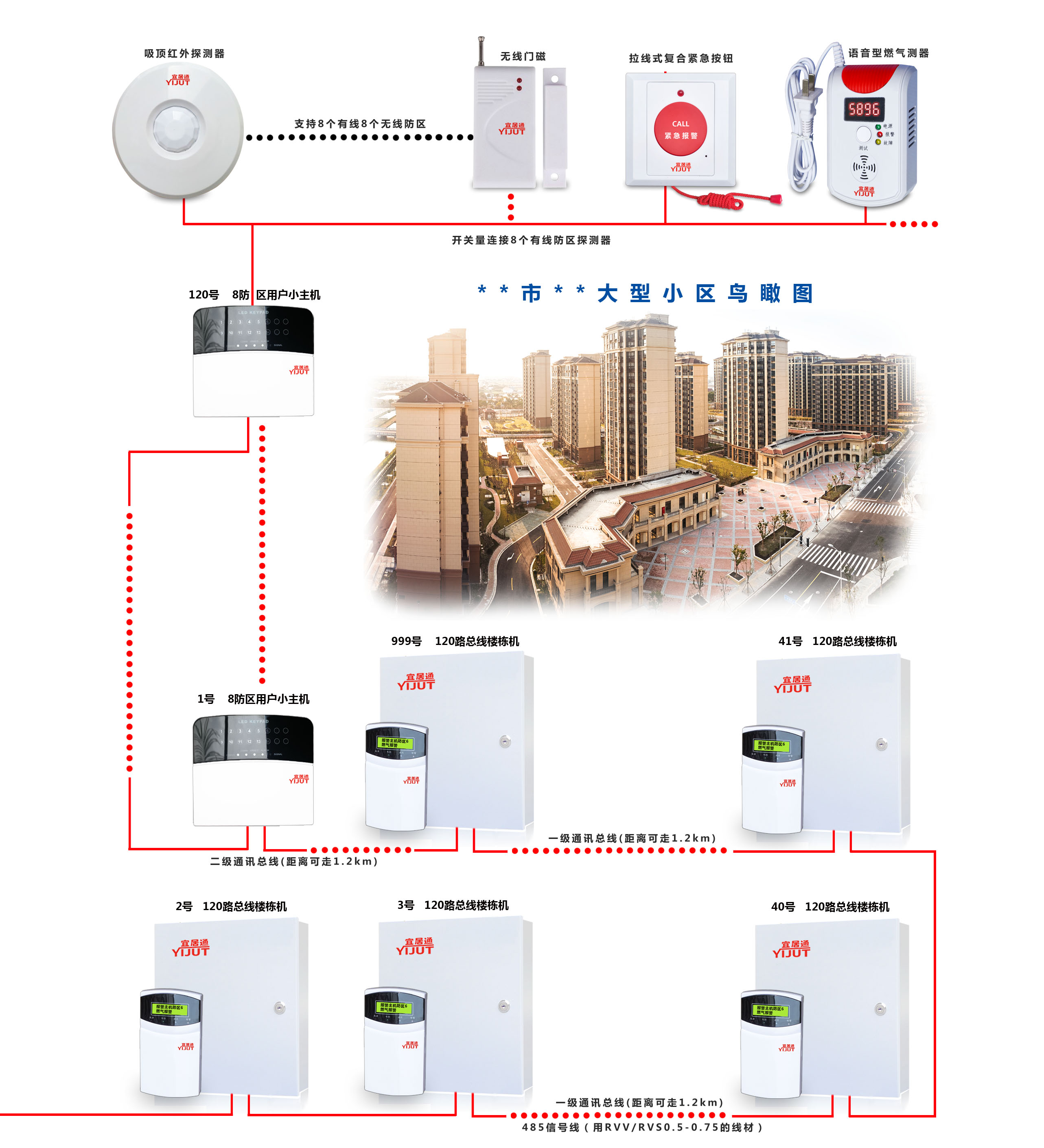 8、支持485擴展外接120臺總線樓棟機,且支持電話聯(lián)網(wǎng)使用。(其他廠家大部分不支持110聯(lián)網(wǎng)報警功能)