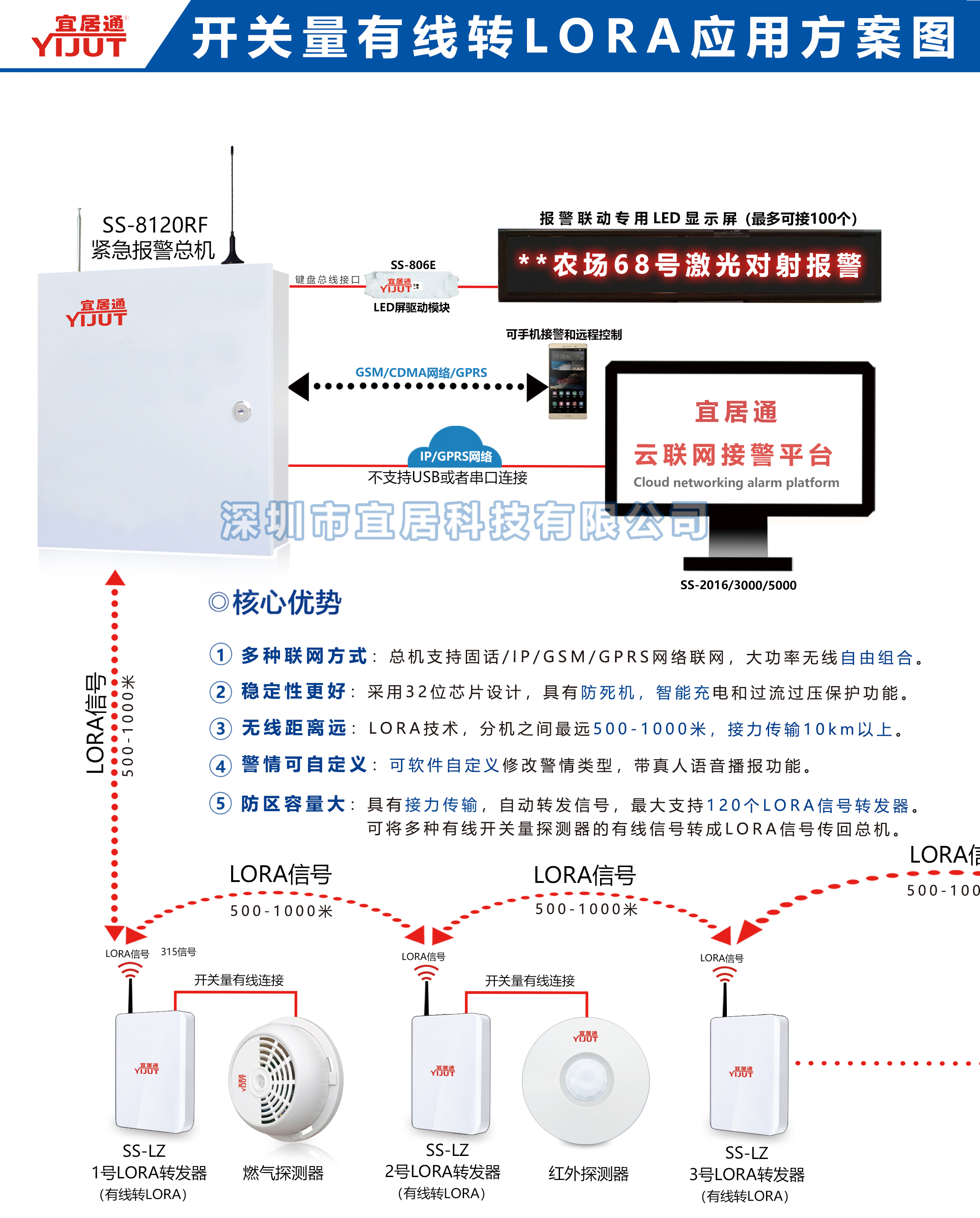 此次貴陽安防展,深圳市宜居科技將全面展示8大系列的安防報警產(chǎn)品,比如大型總線聯(lián)網(wǎng)報警主機系統(tǒng)、IP網(wǎng)絡(luò)報警主機系統(tǒng)、GSM聯(lián)網(wǎng)報警主機系統(tǒng)、脈沖電子和張力電子圍欄周界報警系統(tǒng)、防爆紅外報警系統(tǒng)、燃氣檢測報警系統(tǒng)、一鍵緊急求助報警系統(tǒng)等、對射光柵報警系統(tǒng)。其中多數(shù)是升級換代的產(chǎn)品和方案,部分是全新的,比如LORA系列的產(chǎn)品第一次完美展示,從前端的緊急按鈕等探測器,到中間的LORA信號轉(zhuǎn)發(fā)器,再到后端的報警控制主機和管理平臺軟件,一整套LORA無線綜合解決方案和配套產(chǎn)品,而不是某個單一的LORA產(chǎn)品,除了LORA系列的產(chǎn)品之外,傳統(tǒng)的大型總線報警主機系統(tǒng)也進行了多次升級,總線報警主機將支持4G模塊通訊,且支持LORA無線組網(wǎng)聯(lián)網(wǎng),將LORA無線和485有線進行很好的融合,以便更好的滿足今后一段時期內(nèi)無線距離不夠遠,485布線又不方便等問題,一臺報警主機就可以很好的解決485有線聯(lián)網(wǎng)和LORA無線組網(wǎng)聯(lián)網(wǎng),穩(wěn)定性、安全性、經(jīng)濟性、聯(lián)網(wǎng)冗余性都有了質(zhì)的提升和飛躍,是目前市面上LORA主機功能最全、配套最完善、穩(wěn)定性好、性價比高的一套LORA報警主機系統(tǒng)。